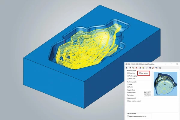 Algorytm frezowania kieszeni został całkowicie przeprojektowany dla trybu zgrubnego tej strategii, aby osiągnąć większą efekty wność i lepszą kontrolę nad obróbką. Nowa wersja szczególnie sprawdza się przy obróbce z dużymi szerokościami naddatku oraz przy pozostającym materiale. Dodatkowo można zdefiniować promień konturu i promień ścieżki, co umożliwia lepszą kontrolę zaokrągleń ścieżki narzędzia. Promień konturu stosowany jest dla ścieżek prowadzonych wzdłuż geometrii modelu, natomiast promień ścieżki dla wszystkich pozostałych przesuniętych torów.