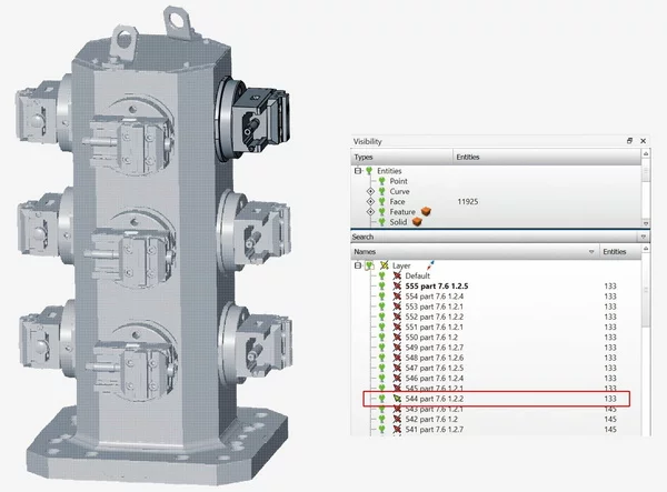 Dzięki nowej funkcji „Włącz/wyłącz widoczność” zyskujesz znacznie lepszą wydajność podczas pracy z dużymi złożeniami. Już przed załadowaniem pliku można ustawić wszystkie warstwy jako nieaktywne, co sprawia, że model od początku działa płynniej. W razie potrzeby można aktywować poszczególne warstwy, aby przeprowadzić konkretne edycje.